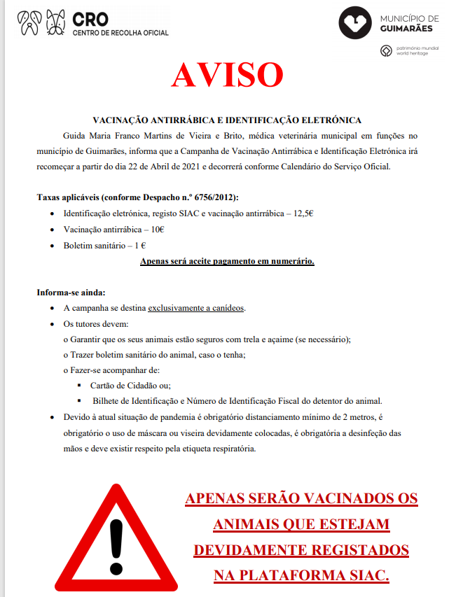 - Apenas serão vacinados os animais devidamente registados na plataforma SIAC (o registo SIAC é efetuado nos Centros de Atendimento Médico Veterinário);